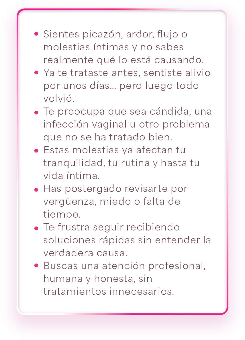 Si presenta síntomas como picazón, ardor, flujo diferente a lo habitual, mal olor o molestias íntimas recurrentes, lo más recomendable es una evaluación ginecológica. No todas las molestias íntimas son lo mismo, por eso es importante revisar cada caso de manera profesional.